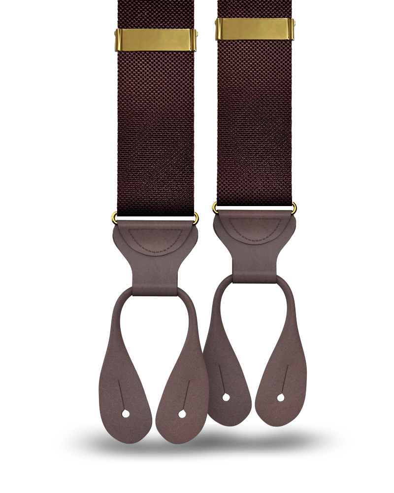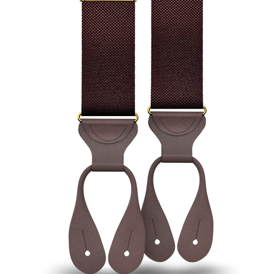 - + Brown Y-Back Elastic Strap, Brown Leather Joiner and Button-on Ends w/ Gold Hardware